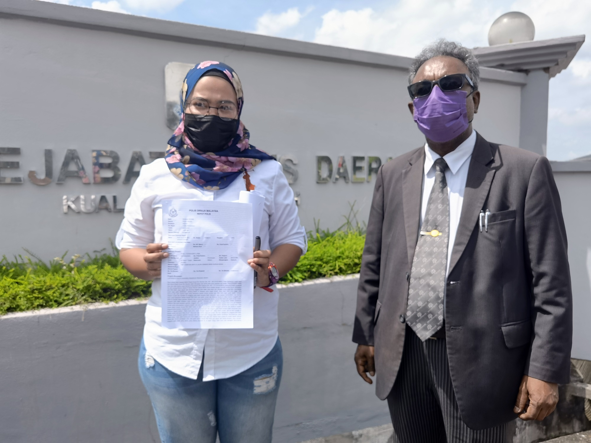 律师迪嘉亚拉连同报案人努鲁阿斯金(22岁)今日到瓜拉姆拉警区总部报案后,在警局外召开新闻发布会。