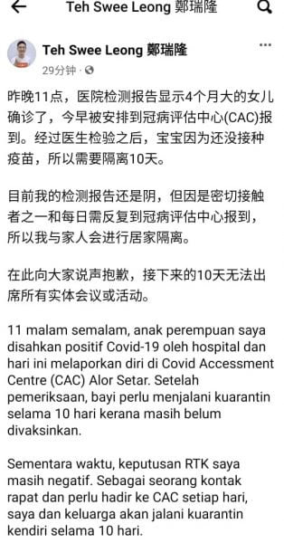 他今日在官方脸书分享贴文说,他是于昨晚11时,接到女儿的冠病检测报告证实确诊,并于今早被安排到冠病评估中心(CAC)报到。
