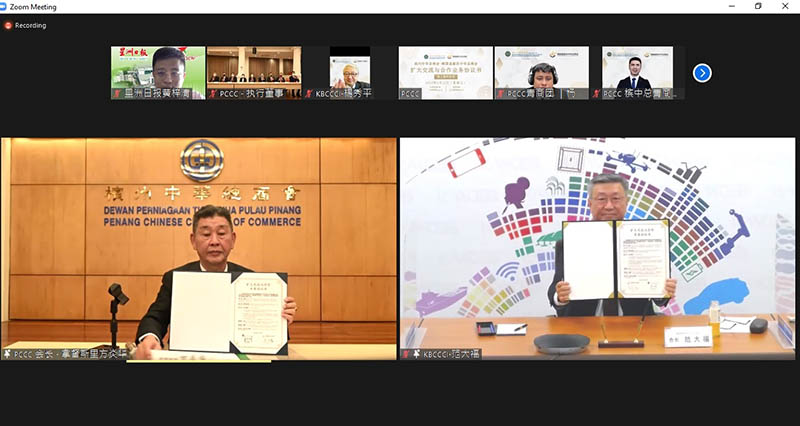 (槟城22日讯)槟州中华总商会与韩国釜蔚庆中华总商会为促进韩国和马来西亚槟州华商贸易往来,今日通过线上视频签署“扩大交流与合作业务协议书”,加强双方贸易往来,促进投资,巩固相互之合作关系。