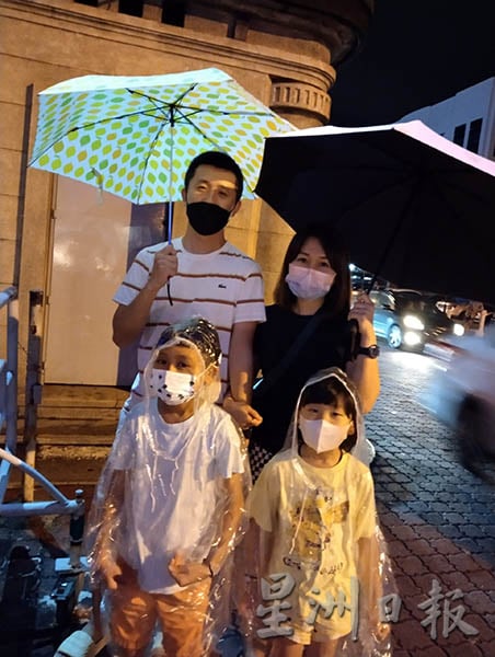 他说,由于阔别此盛典已两年,他们约7时45分就到场。虽然当时已有绵绵细雨,但他们继续撑伞并让孩子穿上雨衣,等看游行。