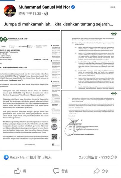 根据莫哈末沙努西昨晚张贴的文字,附图为安华代表律师楼SN Nair & Partners发出的律师信,这一脸书贴文截至今日上12时,已有1万3000余人按赞,927人转发,2827则留言。
