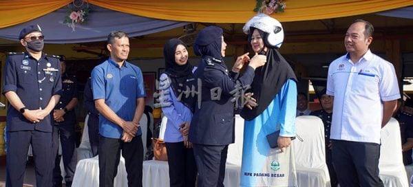 苏丽娜在玻州交警主任赛夫丁(左起)、玻州副局长拉赛迪及玻州社险机构副主任札那及斯里敦绒国小校长纳兹里(右)陪同下,为摩托车骑士换新头盔。(张洁盈摄)