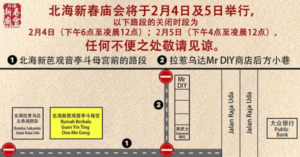 (北海3日讯)为了让于明后2天举行的北海新春庙会之癸卯元宵庆丰年顺利进行,新芭观音亭斗母宫前的路段(Lorong Perniagaan Melur 1)及拉惹乌达Mr DIY商店后方小巷将暂时封路。