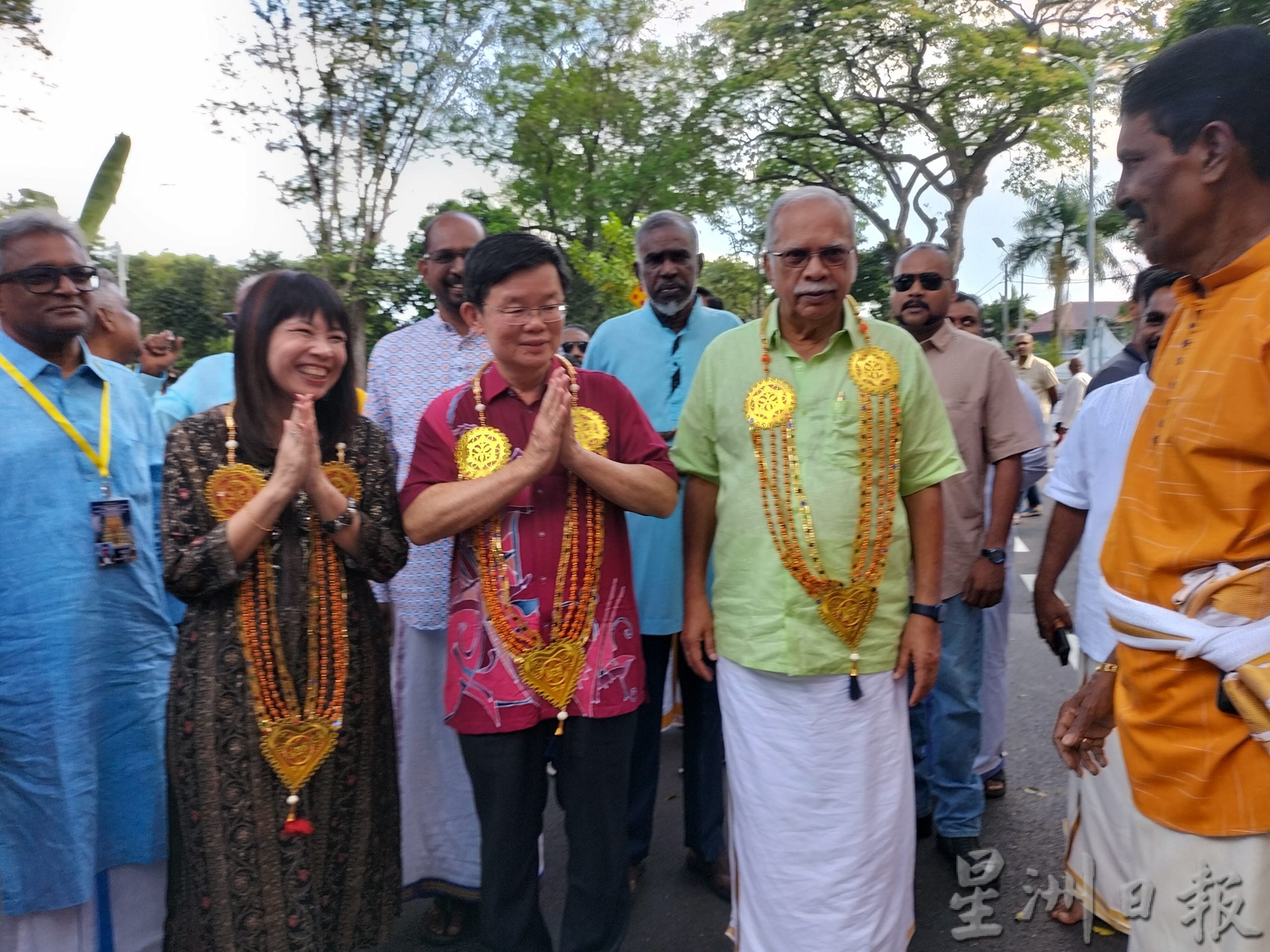 曹观友和拉玛沙米也在教育部副部长林慧英、州议员王耶宗、黄顺祥、李俊杰和沙迪斯等人的陪同下,从中路槟州兴都慈善基金会开始,步行至西方路和瀑布路,视察庆典会场。