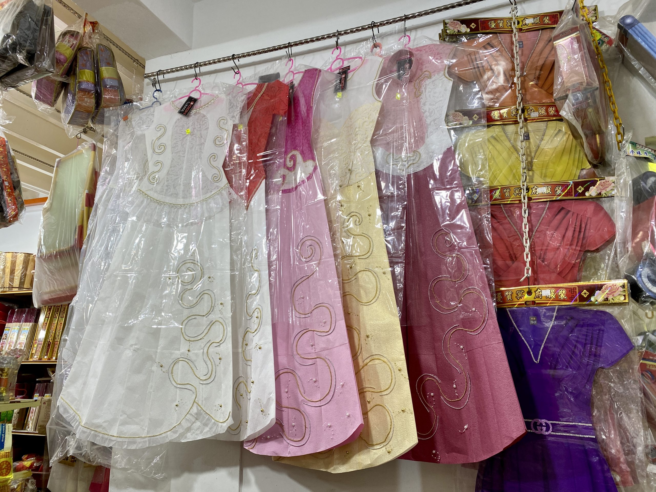 他说,一些时下最夯的“海底捞”、“铁板烧”、“快餐”等纸扎品,也能在其店里找到。其余产品包括男女装服饰与配件,女装则有长短裙、小洋装、晚礼服及吊带裙等。
