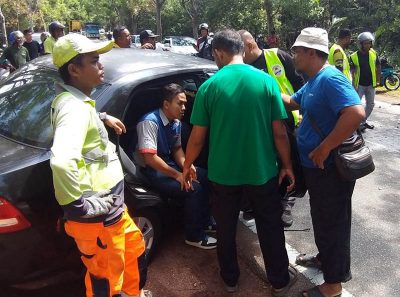 双溪大年消拯队接投报后很快抵达现场,使用工具撬开车头,耗1小时左右才成功救出被夹困车内的华商。
