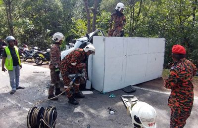 (双溪大年5日讯)冷气代理商载妻儿外出安装冷气途中,与国产车迎面相撞,所驾驶货车随后斜倒横摆路中,他则被夹困车内,妻儿在民众帮助下,顺利从车窗爬出来,只是轻微擦伤。