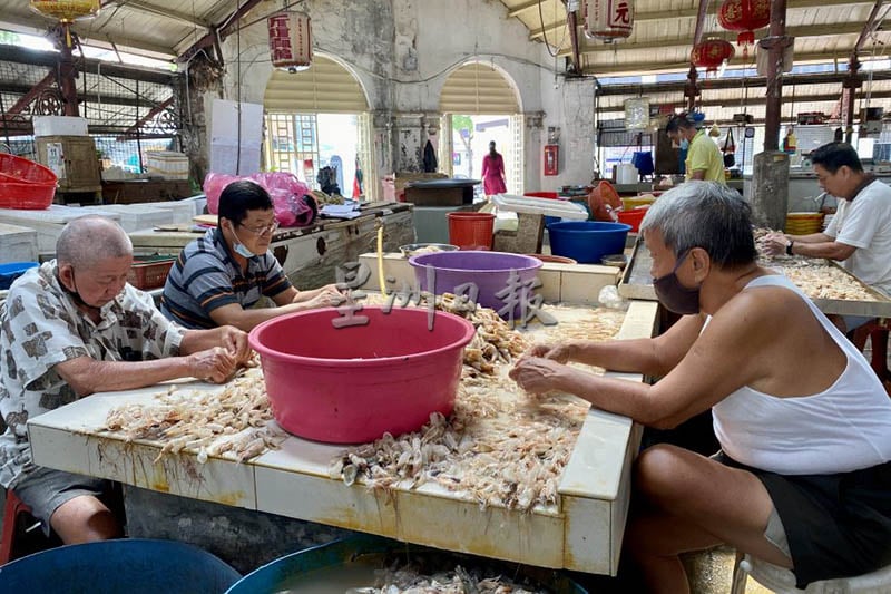 小贩们正在处理虾壳,之后供应给餐馆使用。