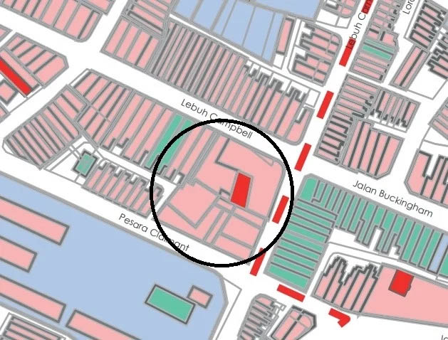 在2016年乔治市世遗特区蓝图中可见,新街头巴刹(圆圈处)以粉红色标识为第二类古迹,标识红色的部分为第一类古迹,也即是巴刹里的马来人墓地。(截图)
