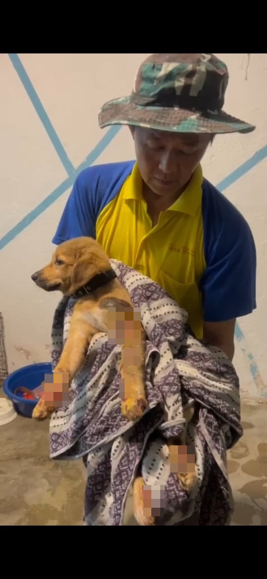 SPCA负责人王振维于午夜12时左右,把伤痕累累的小狗送去槟岛一家24小时兽医诊所救治。