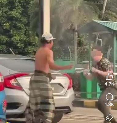 根据一段在社交媒体热传的影片显示,这宗马路“擂台秀”今午发生在武吉淡汶南部收费站,一辆由“马来武士”驾驶的蓝色 bezza与“黄飞鸿”的银色本田在收费站前疑是有人不遵守交通规则引起纷争,两名司机过后下车在路上“比武”。