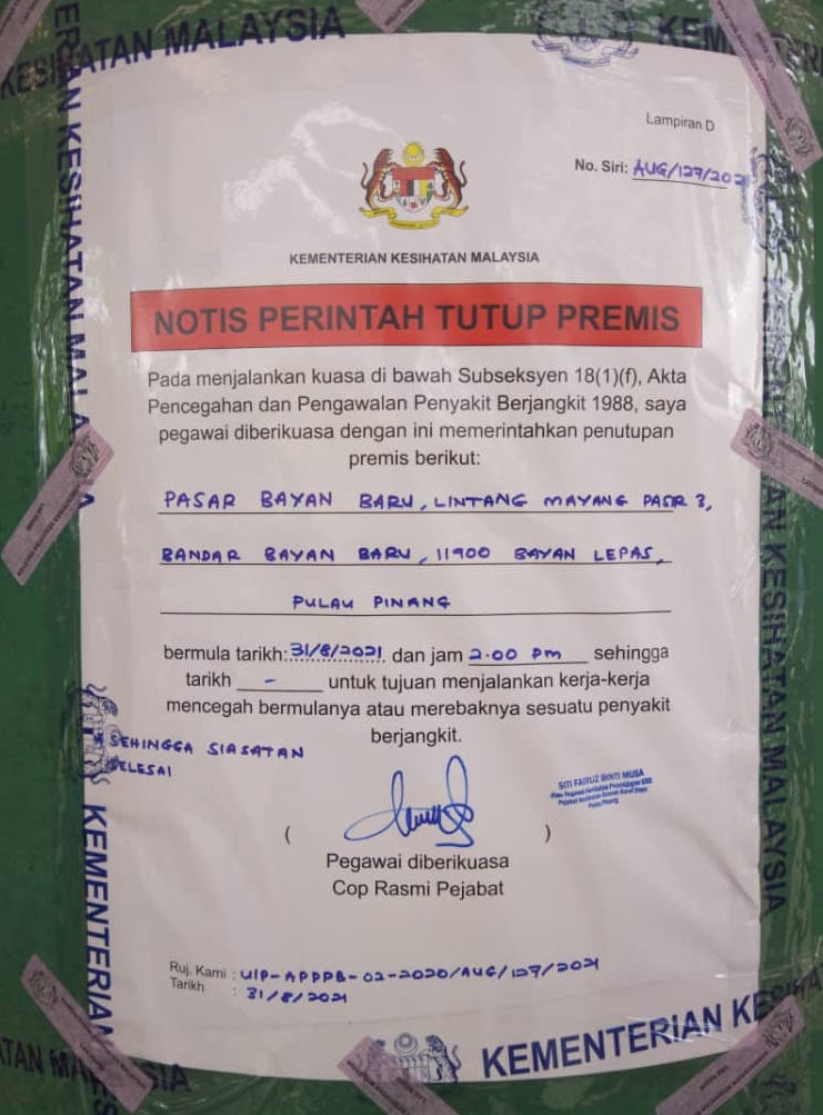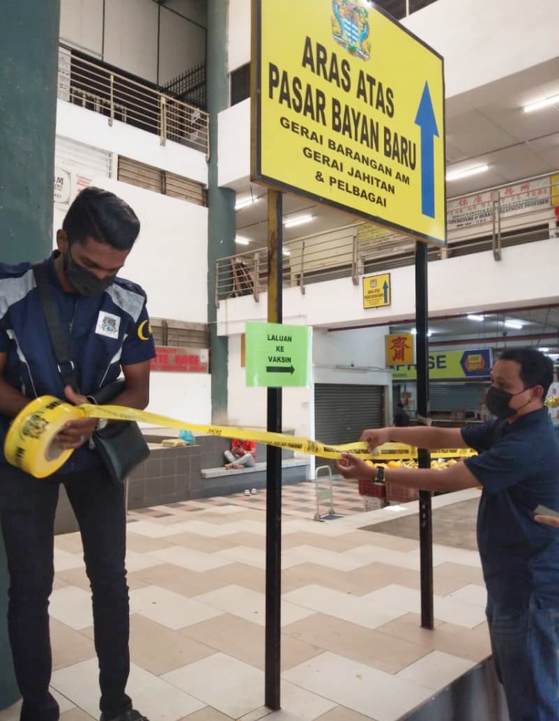 槟岛市政厅今早发文告说,该巴刹内有159个摊位,消拯员将负责接下来的消毒工作。