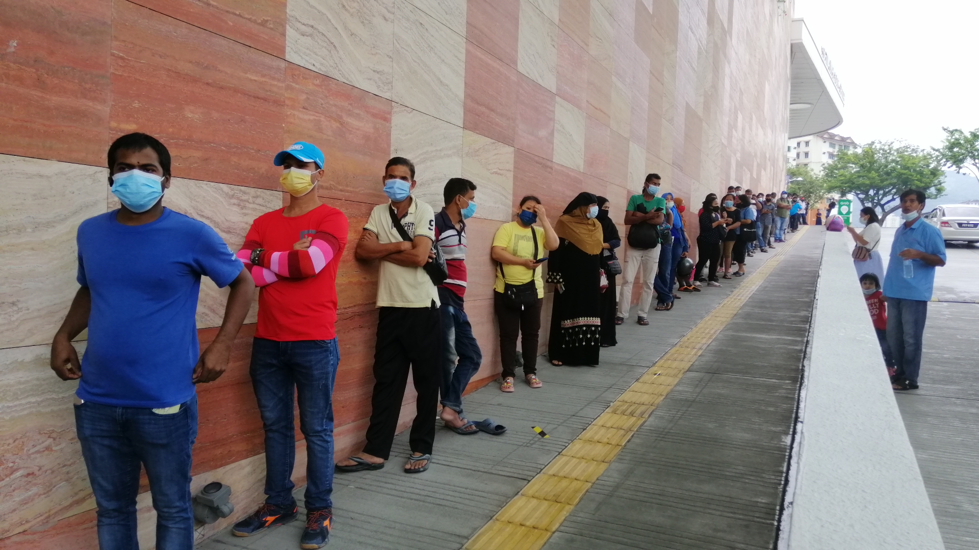 在槟城国际会展中心会展厅,一些外籍人士下午1时已前来等待。该中心派出多名工作人员在场维持秩序,尽管与部分外籍人士因语言问题沟通不良,但情况大致上井然有序。