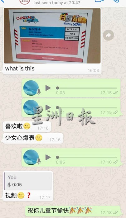 她说,教师们凭著对学生的认识,据他们的喜好来买礼物,除此之外,老师也设计一段儿童节短视频,在“包裹收据”上印二维码,给孩子扫描看视频,献上儿童节祝福。