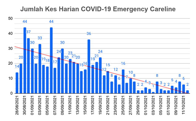 槟州冠病疫情从8月起升温,8月中至9月的每日确诊数据徘徊在1000宗至2500宗,公共医疗设施一度难以负荷,居家隔离的确诊者剧增,槟州当局因此设立槟州冠病紧急关怀热线,为患者提供咨询服务。
