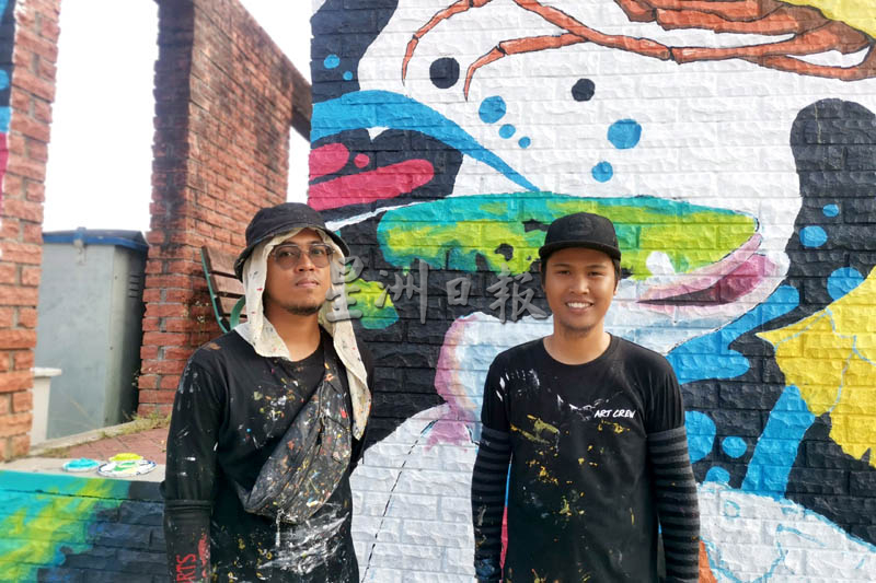 2名来自峇眼色海的壁画家莫哈末阿芝佐(33岁)、莫哈未喜布拉(26岁),两星期前应吉辇县议会的邀请,在巴里文打河边街的休闲公园内的红砖墙面上作画。