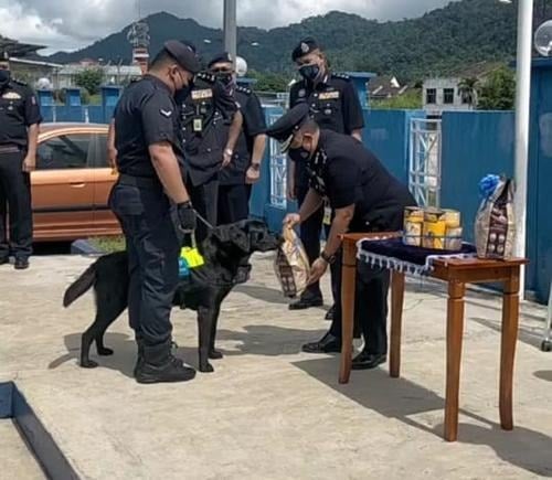 警犬“小黑”是今年2月,协助警方在浮罗交怡甘榜哥里邦的一项毒品取缔行动中,成功侦破毒贩藏在住家附近的亭子处,重约126.4克的海洛因毒品。