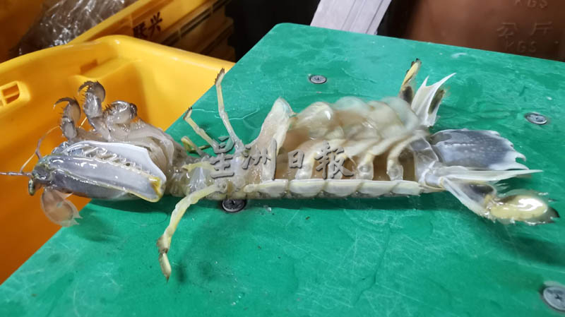 角头当地渔民杜汉雄(50岁)向星洲日报《大北马》社区报记者说,活的“大虾姑”才值钱,所以他们专门研究适合捕捉它的棱网,称为“怪棱网”,除捉大虾蛄,也捕龙舌鱼等。