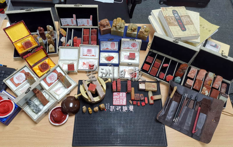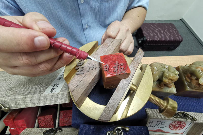 每次雕刻时有分“白文”或“朱文”字体的刻法,先在坐标纸临摹篆文字体及大小,再慢慢一刀一刀在印石上刻出篆文或图案,从浅入深,从简单文字到复杂图案,不急躁才能刻出美丽的作品;普通印章仅需要两三天就能完工。