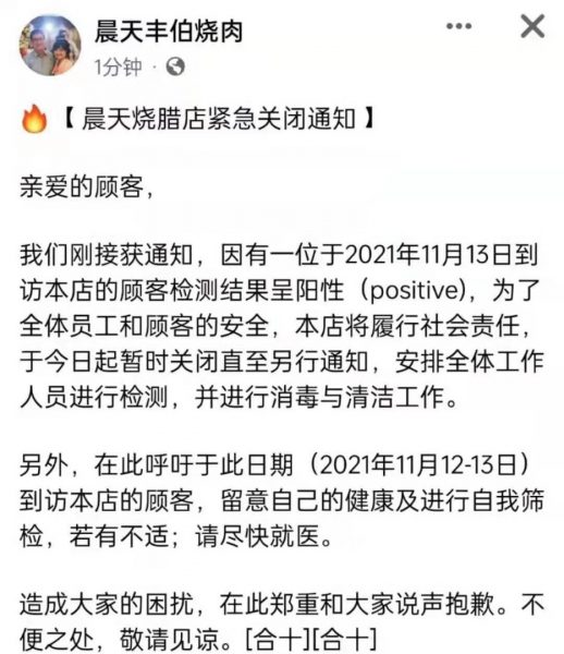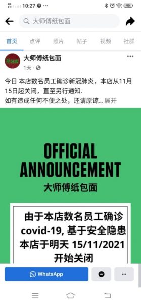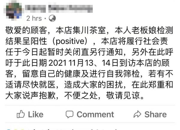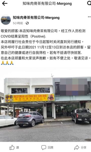 商家们都是于昨日(15日)在各自脸书专页或个人专页,发布因有确诊顾客曾到访光顾,必须紧急关闭进行消毒的消息。