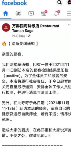 万群园海鲜饭店因有位到访的顾客,冠病检测结果呈阳性,该饭店为了全体员工的安全,将履行社会责任,于14日起暂时关闭消毒,直至另行通知。