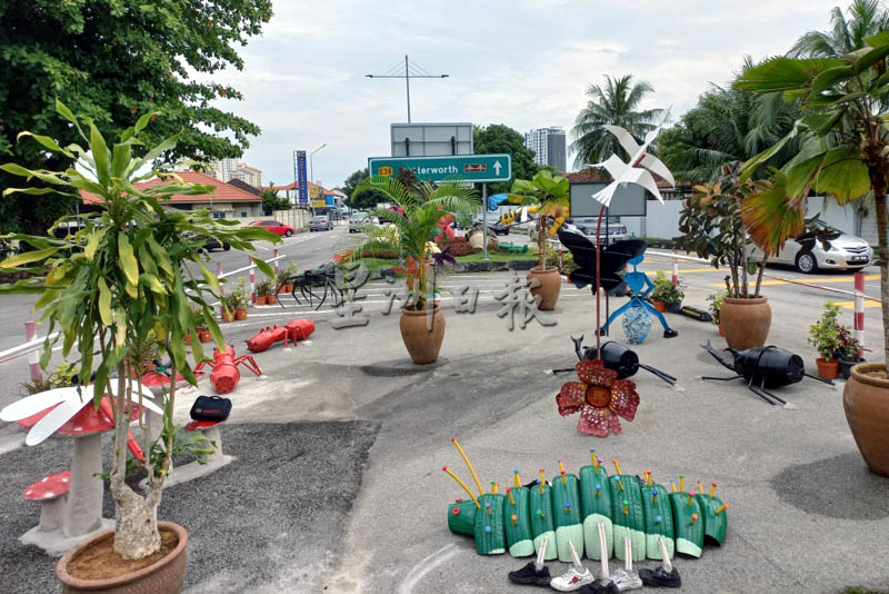 (槟城25日讯)槟岛市政厅使用再循环物,以自然生态为主题美化亚依淡繁忙道路中的一块空地。