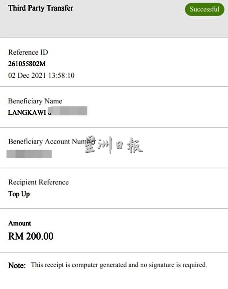 (双溪大年4日讯)不法分子伪造转账记录后,向迷你市场业者要求为电子钱包和电话卡充值400令吉,所幸业者及时发现是骗局,警惕其他商家留意。