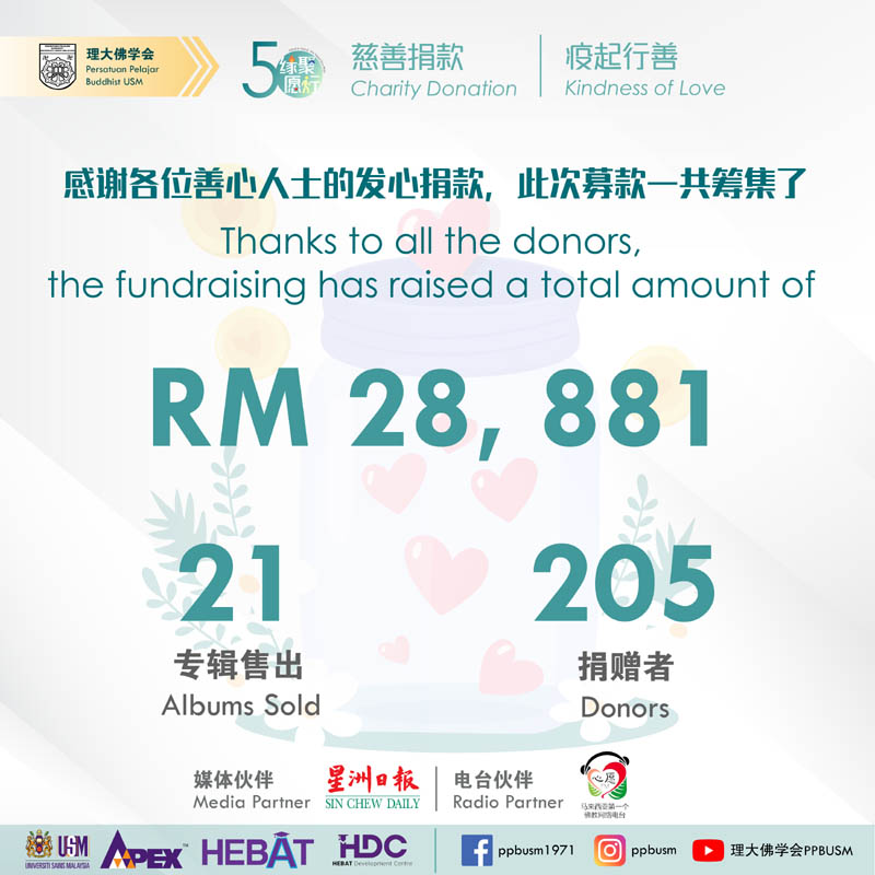 (槟城10日讯)马来西亚理科大学佛学会配合50周年庆特举办的《疫起行善》慈善捐款活动已结束,感谢各界献出爱心帮助净莲慈悲院!