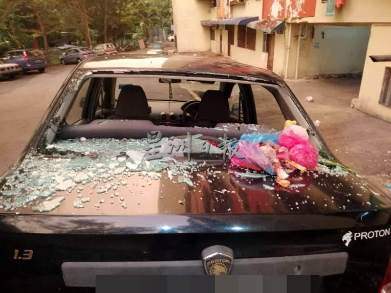 PenangKini脸书专页昨日上载4张照片,显示一辆黑色宝腾轿车,在甘榜马来由组屋底楼被高空丢下的垃圾击破车镜,此贴文引起网民热议。