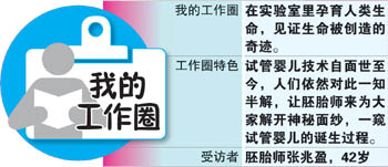 张兆盈说,并非每次的人工受孕都会成功,当胚胎师把认为好的胚胎移植母亲子宫,最后却怀孕失败时,病人会伤心地询问原因,这个时候,胚胎师与母亲一样感到难过。
