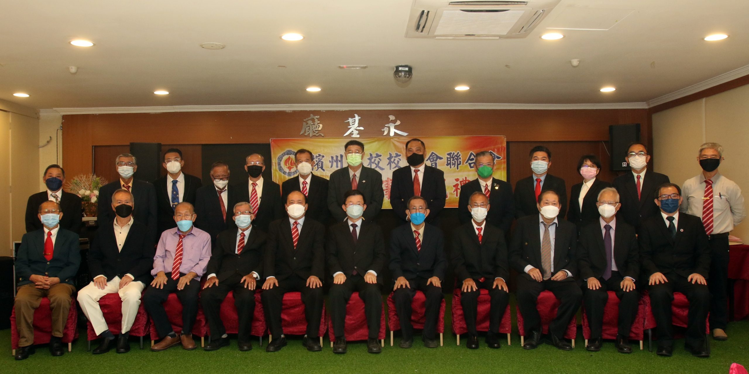 曹观友(前排左六)与槟州华校校友会联合会第20届理事会全体成员合影。(郑振辉摄)