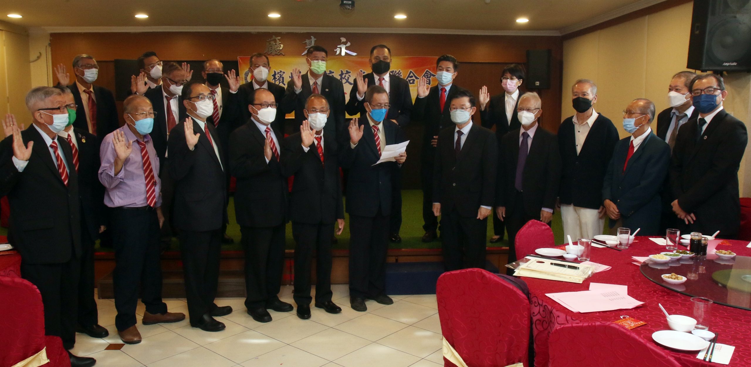 曹观友也在会上,与槟州华校校友联会务顾问蔡亚汉、杨旅祥、拿督许海明及法律顾问许文思、罗汉明,见证由会长傅振造带领新届理事宣誓就职。
