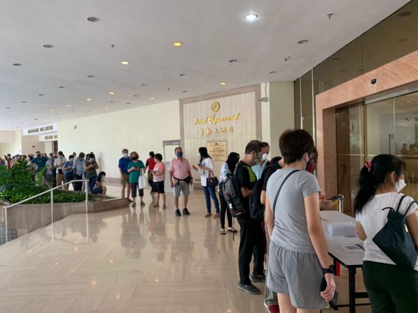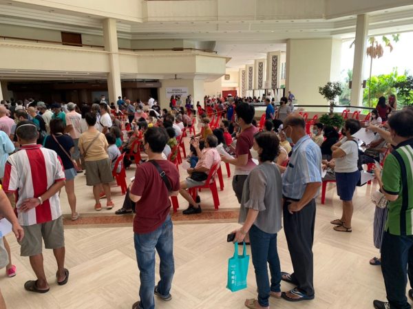 该中心大厅外今早排起2条长长人龙,民众在预约和未预约的柜台前,耐心排队等候登记,以入场接种疫苗。据悉,有民众在早上约7时便到场排队。