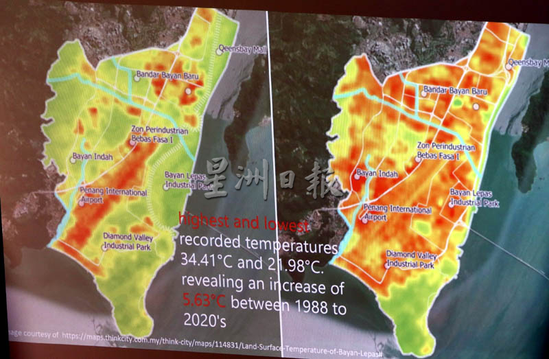 她说,根据Think City的数据,峇六拜工业区于2020年2月时的最高温是34.41摄氏度,最低温是21.98摄氏度。若与1988年2月相比,2020年2月该区的最高温上升了5.63摄氏度。
