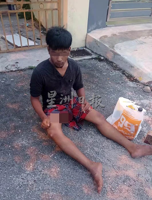 (威南21日讯)带着一袋方便面、赤脚,脚部刮伤的罗兴亚男子,面露倦容呆坐在新邦安拔怡兰园的一间外劳宿舍前面,经居民投报后被警员带走。