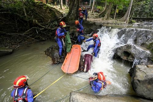 (日得拉25日讯)吉中区洪灾事故敲响拯灾单位警钟,吉打民防部队今日出动逾60人员,深入吉北武吉旺森林公园瀑布区,进行几可乱真的模拟洪灾搜救行动。