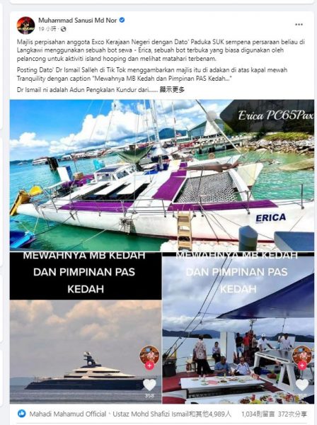 当中,吉打州诚信党万家均乐州议员拿督依斯迈沙列,也在TikTok分享他(大臣)和众人在游艇上的照片,还帖文:“正当有州民遭遇风灾、火灾,屋子都还没获维修当儿,吉州大臣却奢华过活。”