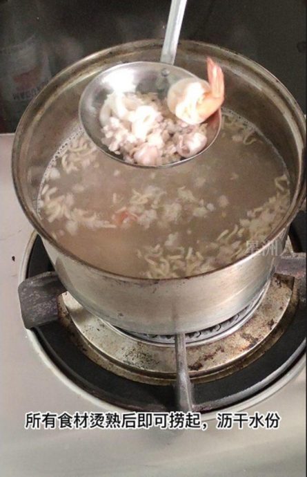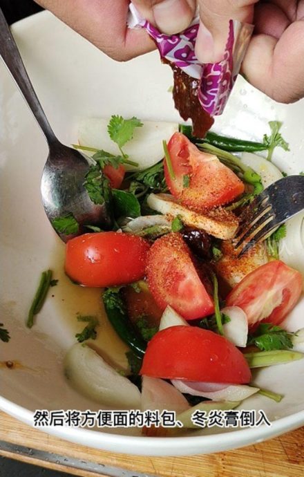 煮一锅足以没过方便面的水,水开下方便面,煮至以筷子能够拨散后,再滚15秒即可捞起沥干水份。煮面的水不倒,将肉碎入锅煮,以筷子拨散肉碎,待肉碎浮起后倒入虾仁与墨鱼,烫熟即可捞起沥干水份。取1口大碗,舀入3汤匙的酸柑汁、1汤匙鱼露、1/2汤匙棕榈糖(可以蔗糖或白糖取代),搅拌至糖溶化。将所有备好的草本食材倒入碗里,香菜摘掉根部,茎与叶摘成段入碗翻拌均匀。然后倒入沥干水份的方便面及肉碎与海鲜,倒入方便面料包及冬炎膏,再翻拌均匀即可。