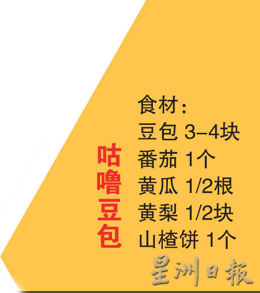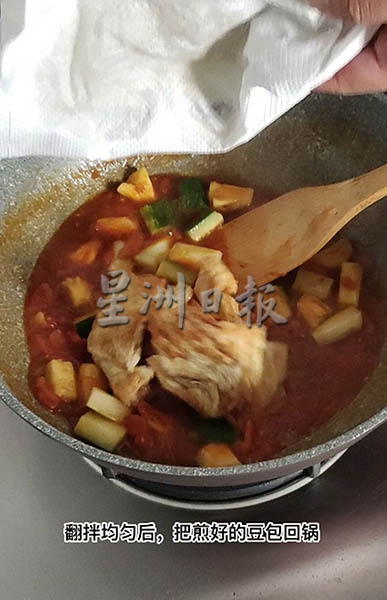 若喜欢炸的也可以,入锅的油较多即可。煎/炸好豆包后的锅留底油,将切碎的番茄倒入炒至出沙,然后把山楂饼掰碎入锅,再以1汤匙番茄酱、少许食盐调味,从锅边倒入大半碗清水,中火熬至山楂饼碎溶化,再倒入黄瓜及黄梨,翻拌均匀。当酱汁开始转浓稠时,以少许麻油及酱青增香调味,然后把豆包回锅,翻拌均匀至所有食材沾上酱汁即可熄火。