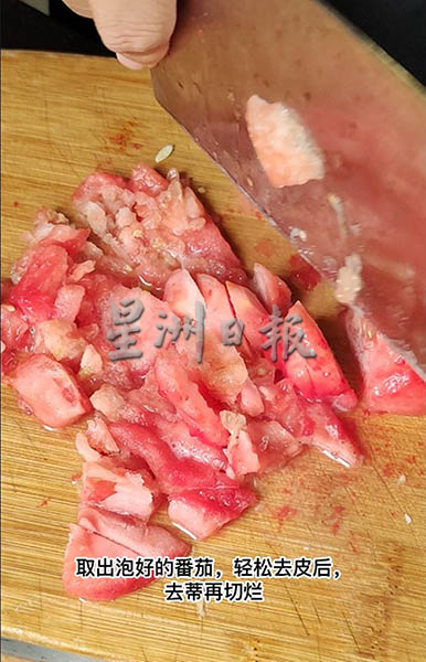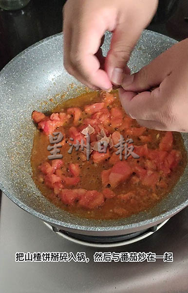把切碎的番茄倒入炒至出沙后掰入山楂饼,然后加水炒溶。