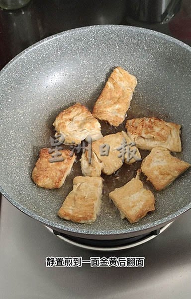 豆包煎至两面金黄后取出备用。若要炸亦可。