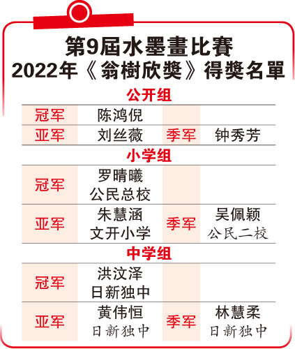 (槟城18日讯)第9届水墨画比赛2022年《翁树欣奖》今早在槟城韩江小学举行,获得134人参赛,圆满落幕。