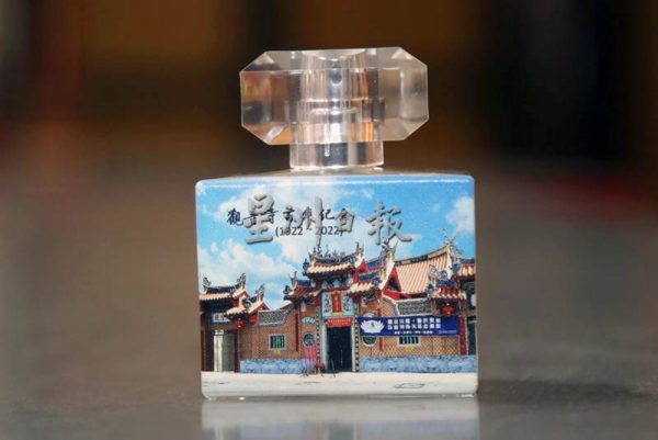 檀香香水用檀香木香精制成,今日在峇眼国会议员林冠英的要求下亮相,香水玻璃罐装正面印有该宫现今的宫庙照片,背面则放该宫创庙时的照片。林冠英也在现场喷洒,让媒体记者率先闻到这独特的香味。