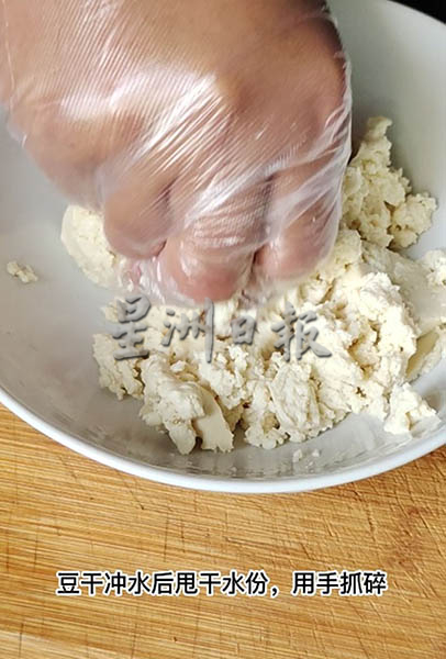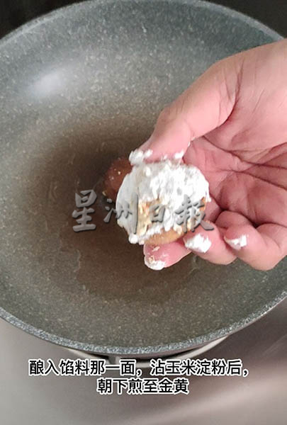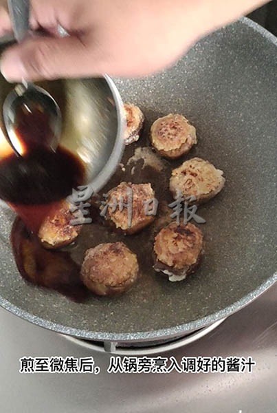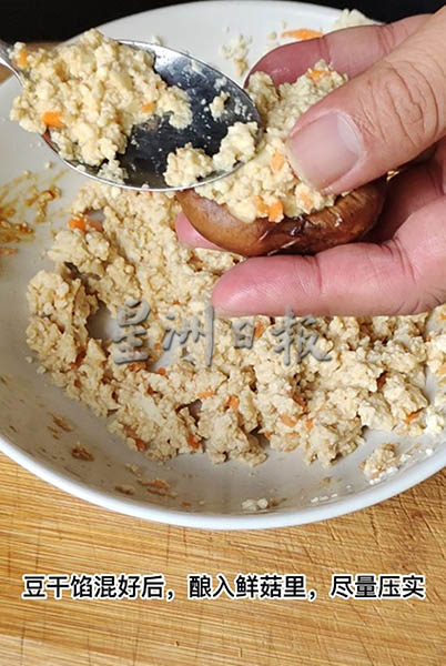 今次的酱汁方面,稍微比较乾。若喜欢更湿润的口感,则可以添加多一倍的清水,即一辆汤匙的清水。但记得,捏一丁点儿的盐加入酱汁内,免得酱汁因为加水而淡了。还有一点需要提醒的是沾玉米淀粉主要是让豆干馅与鲜蘑菇不容易脱落,所以玉米淀粉别沾得太厚,否则影响口感。