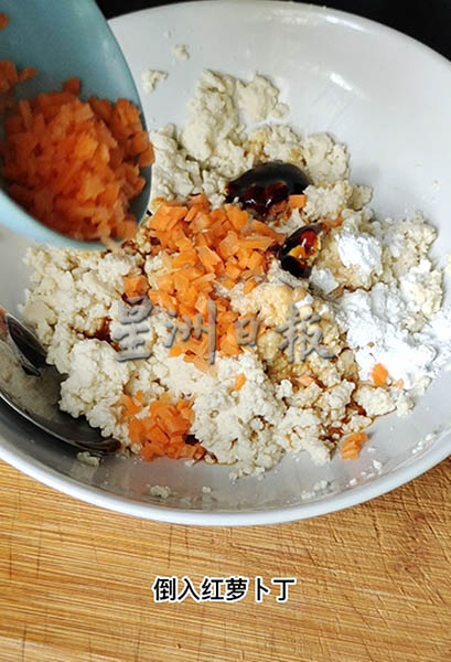红萝卜切成片后再切成细丁;青红辣椒各1小段,去籽后切成细丁,备用。鲜蘑菇去蒂,冲洗乾净后甩乾水份备用。豆干冲洗乾净后甩乾水份,然后将豆干抓碎,调味加入盐及白糖各半茶匙、1茶匙玉米淀粉、1.5茶匙酱青、1茶匙素蚝油、少许胡椒粉,倒入红萝卜丁搅拌均匀为馅料。取鲜蘑菇酿入豆干馅料,以手指头稍微压得扎实,再以汤匙抹平整。