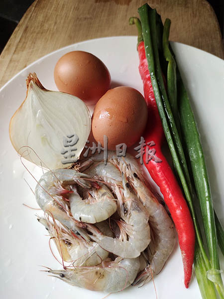| 食材:鸡蛋 2个、小虾 8-10只、荷兰葱 1/2个、红辣椒 1/2条、青葱 2条 |
