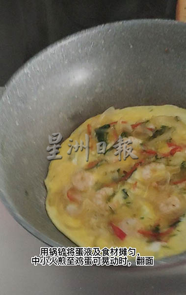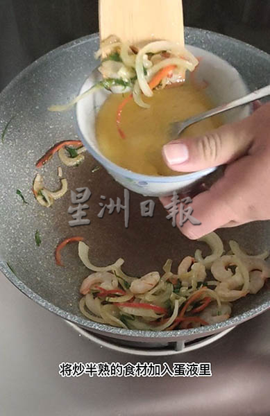 对于这道菜的特别提醒时,各种丝与虾仁炒至半熟后混合蛋液再回锅比较方便,这么一来可以让所有食材被蛋液裹住,煎制起来才口口蛋香。