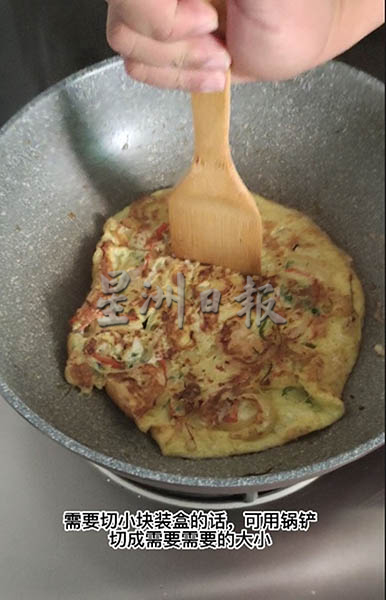 煎至飘出香气及锅中的鸡蛋可晃动时,翻面。鸡蛋煎至两面金黄即可出锅。倘若要打包装盒,可以熄火了再以锅铲切成所要的大小块。