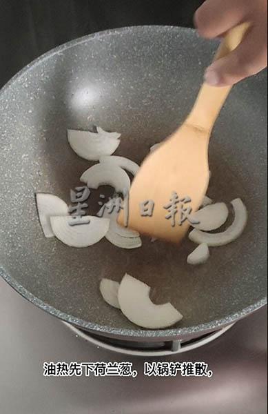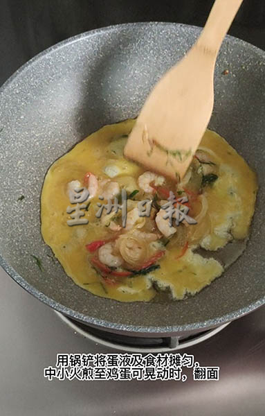 起锅热2汤匙油,油热转中小火先下荷兰葱,荷兰葱入锅后用锅铲将葱片推成葱丝,然后加入少许食盐调味,炒至荷兰葱开始转透明时,加入辣椒丝及葱丝拌匀,然后再加入虾仁稍微翻炒即可取出加入蛋液里。