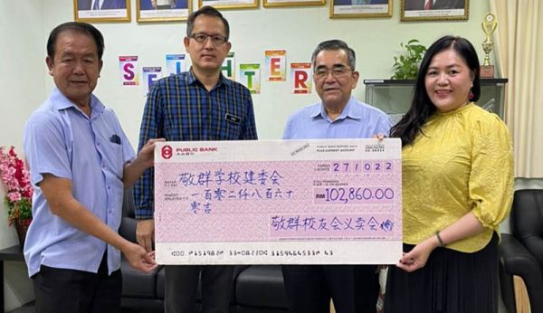 敬群校友会会长林明花(左一)移交百年校庆义卖会模拟支票给建委会主席拿督陈建宝,董事会顾问拿督李振兴(左二起)及陈楚汉校长见证。